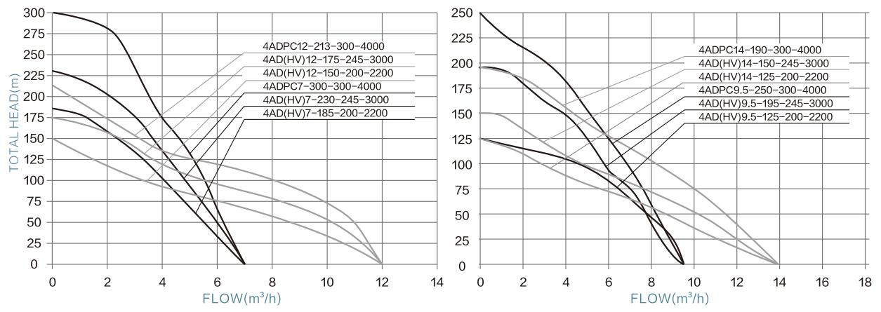 | 4ADPC12-213-300-4000 | 120V-280V | 300V-350V | 4000W | 12m³/h | 213m | 2" | 2m | <450V | ≥1.3*PUMP POWER |