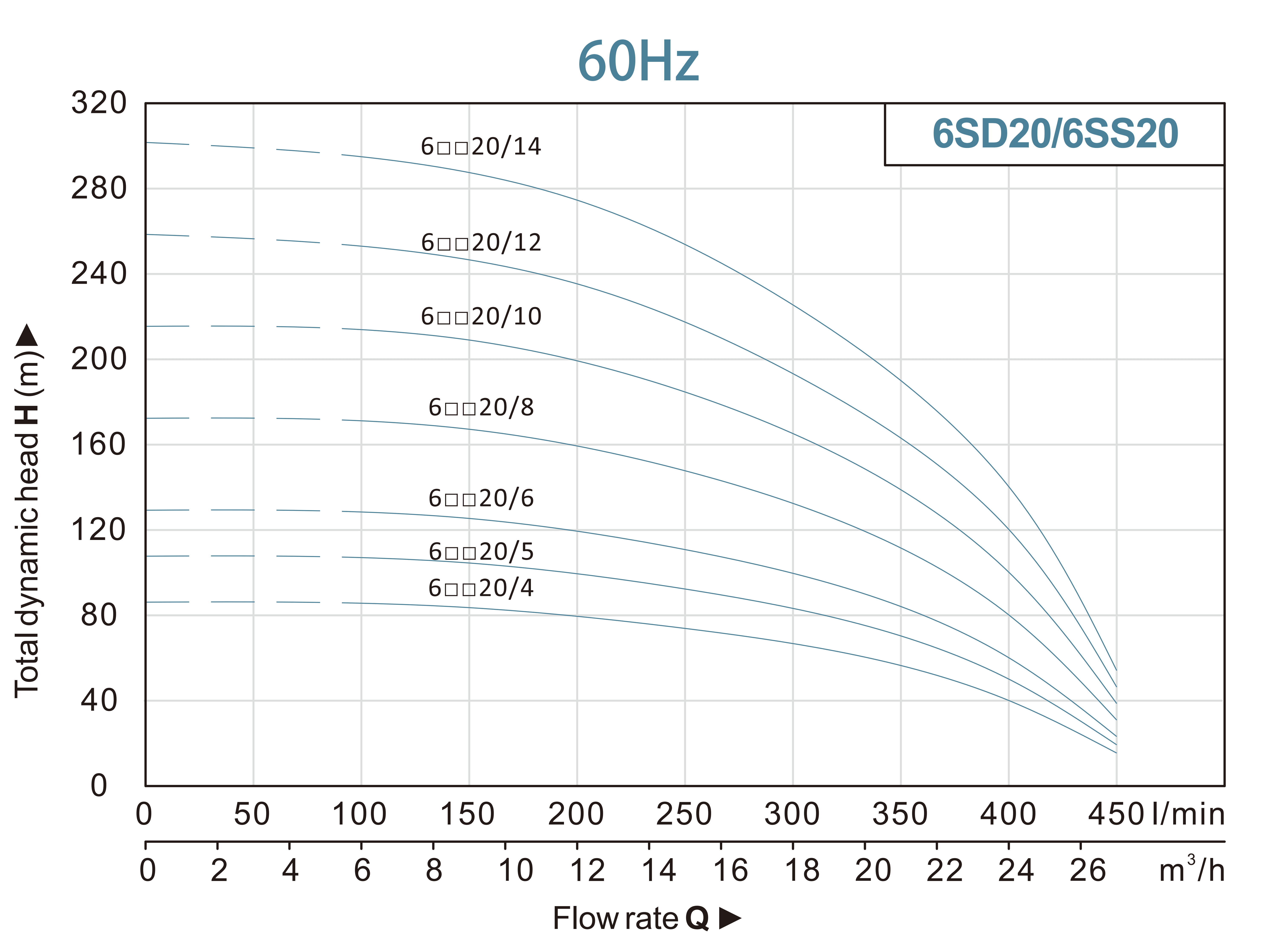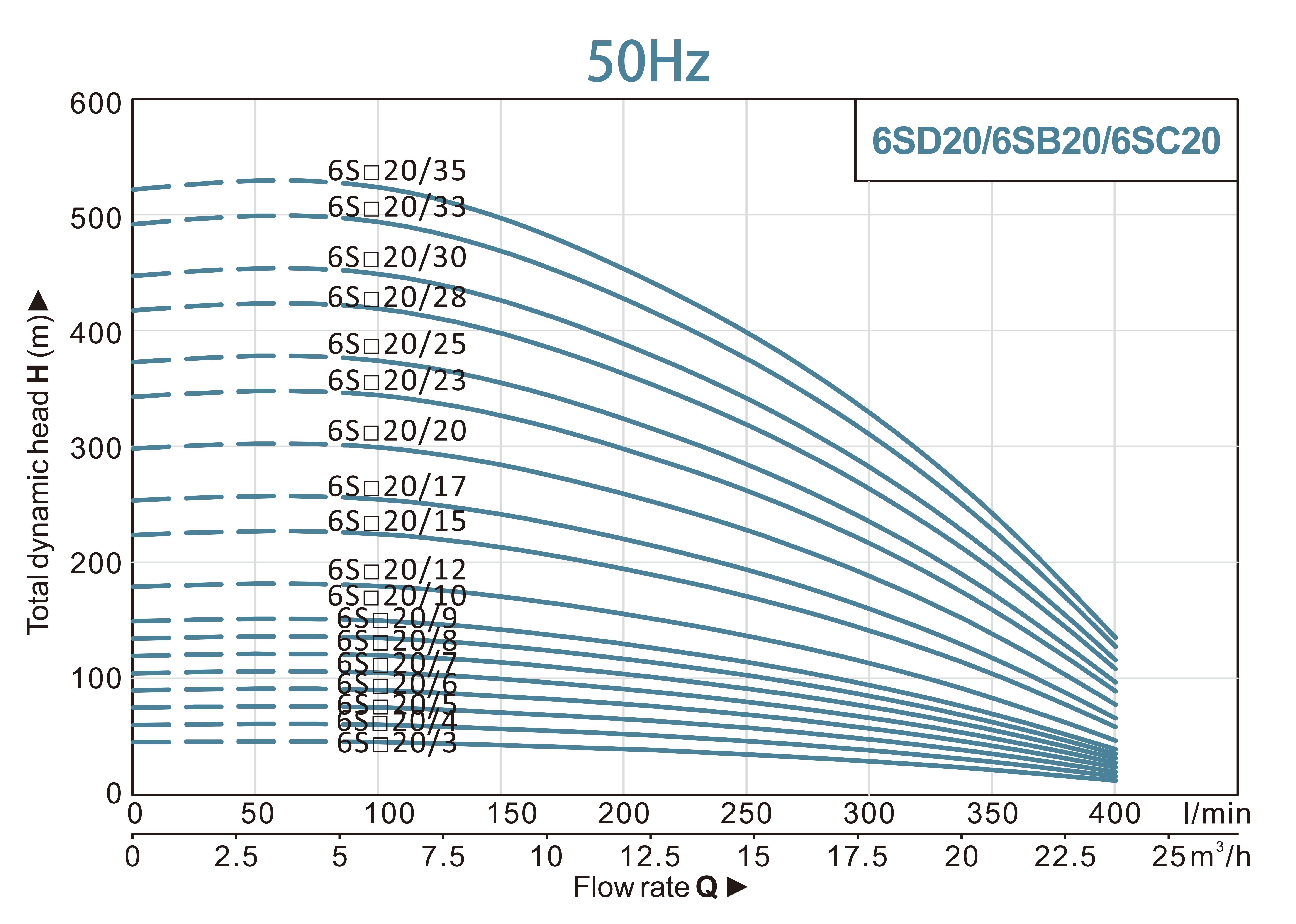 | 6S□ M20/3 | 6S□ 20/3 | 2.2 | 3 | H(m) | 45 | 45 | 45 | 42 | 39 | 34 | 28 | 21 | 12 |