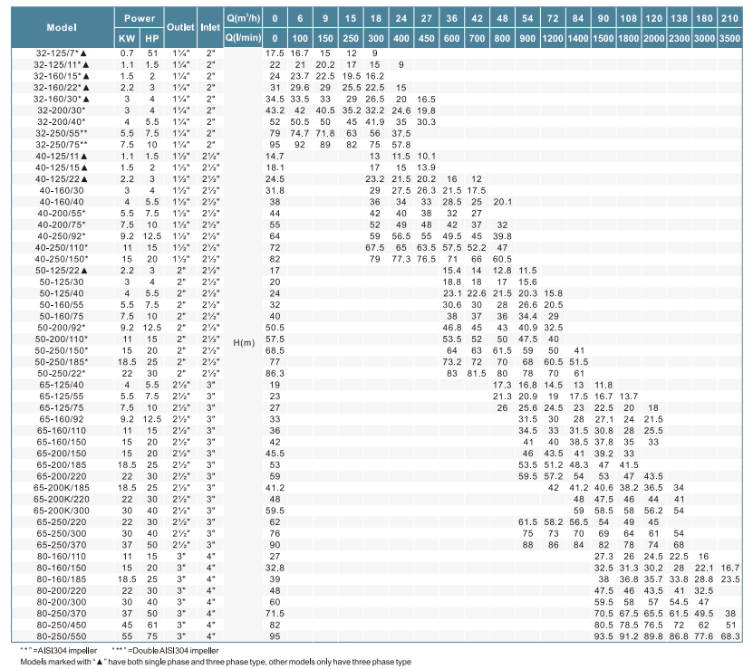 Impeller: AISI304/HT200 material, providing corrosion resistance and durability.