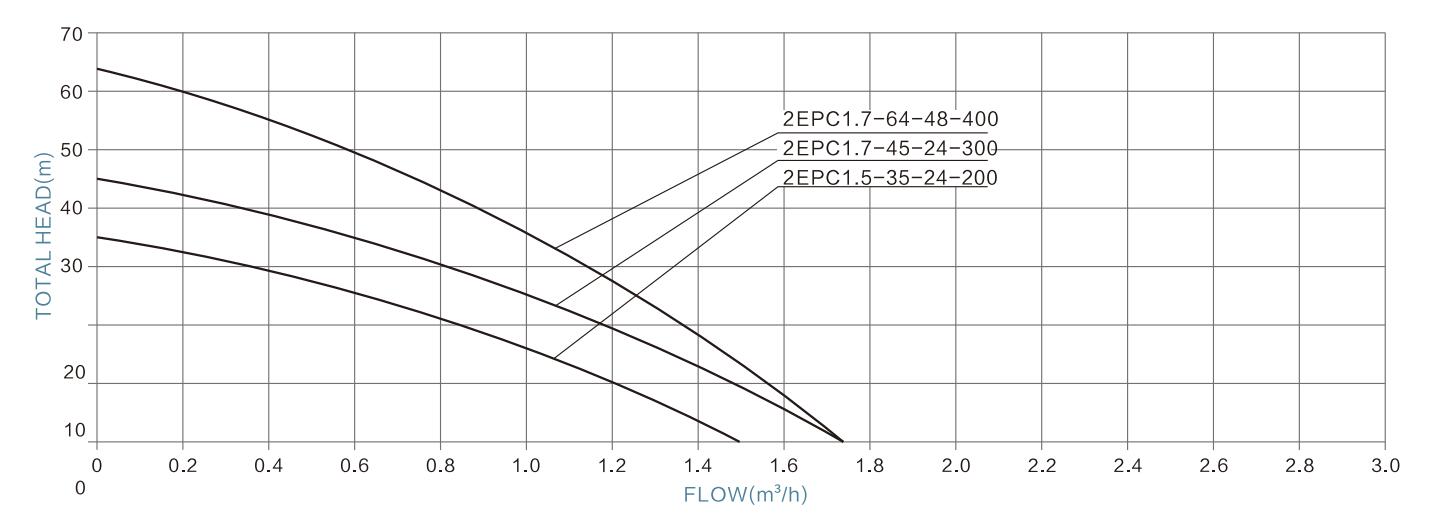 | 2EPC1.5-35-24-200 | 24V | 30V-48V | 200W | 1.5m³/h | 35m | 0.75" | 2m | <60V | ≥1.3*PUMP POWER |