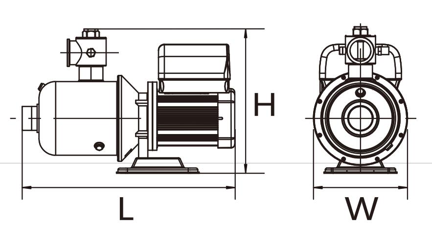 | Model | Frequency(Hz) | Power(W) | Max.flow(L/min) | Max.head(m) | Max.rpm(r/min) | Inlet&Outlet(inch) | N.W.(kg) | Size(L×W×H)(mm) |