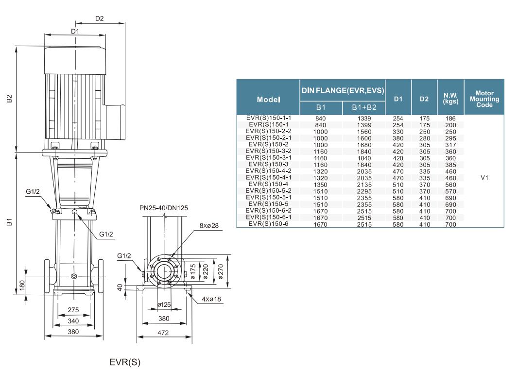 | EVR(S)150-6 | 75 | 157 | 153 | 149 | 145 | 142 | 139.5 | 137 | 130 | 123.5 | 116 | 109 |
